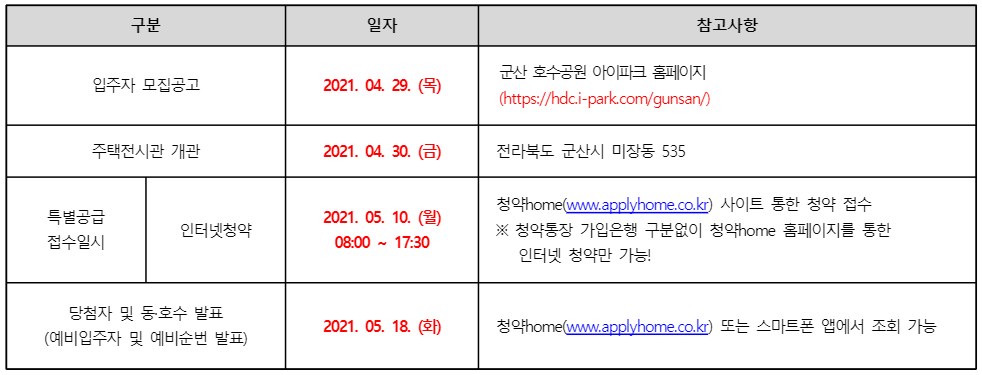 군산 호수공원 아이파크의 분양일정이 나왔습니다. 4월 29일 입주자모집공고 발표 에정입니다. 확실하게 나온 일정이 아니고 예정이니 변동될 수 있습니다. 분양일정은 참고만 하시기 바랍니다.