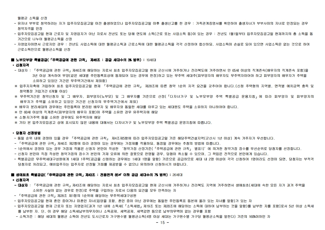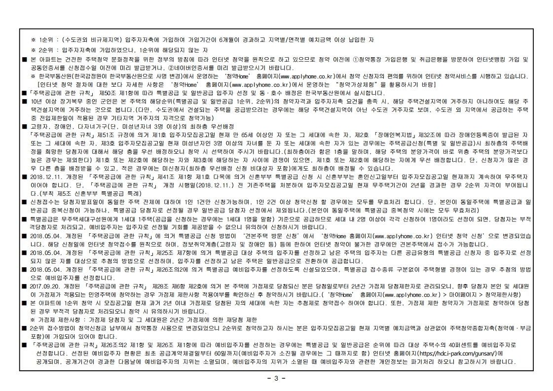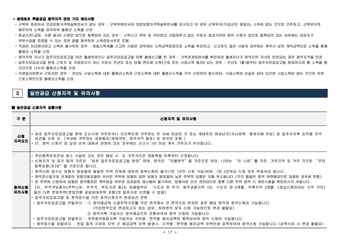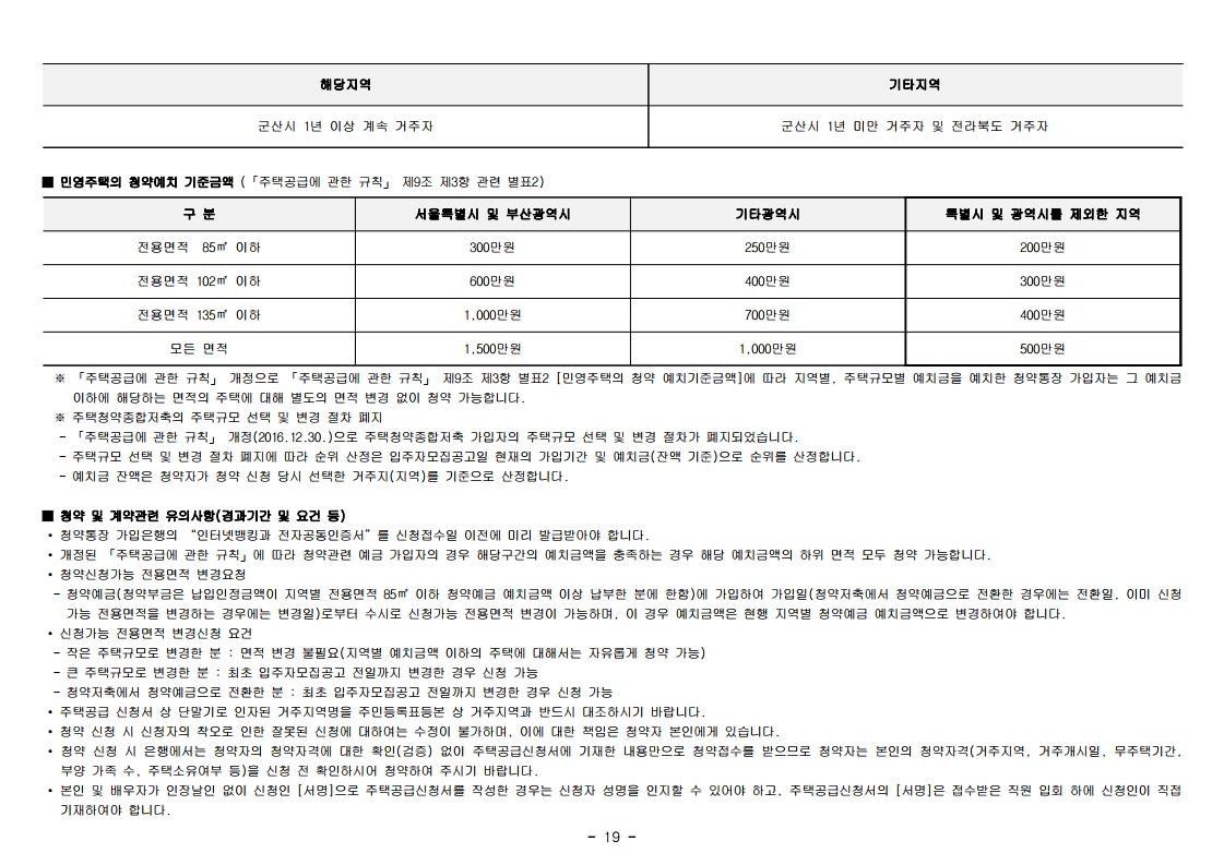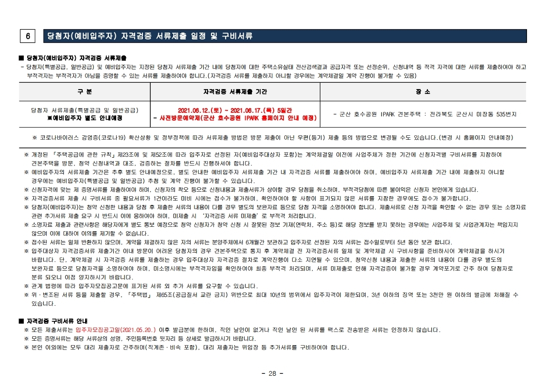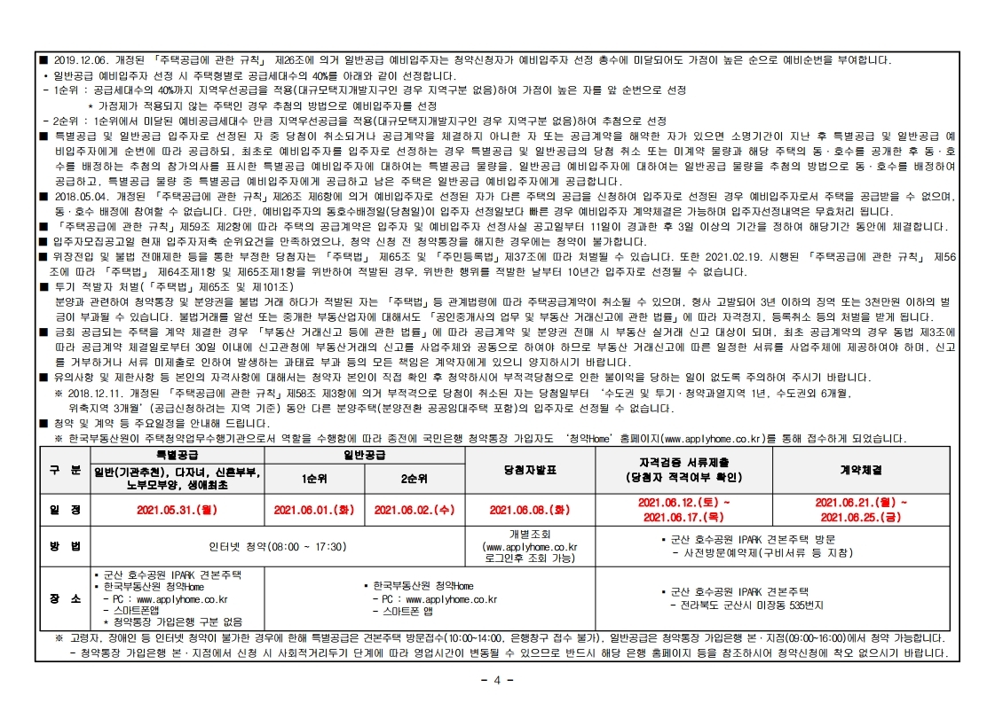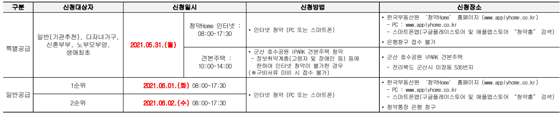 청약신청자 중 같은 순위 내에 경쟁이 있을 경우 해당 주택건설지역인 군산시에 1년 이상 계속 거주자(2020.05.20.(포함) 이전부터 계속 거주)가 우선합니다.