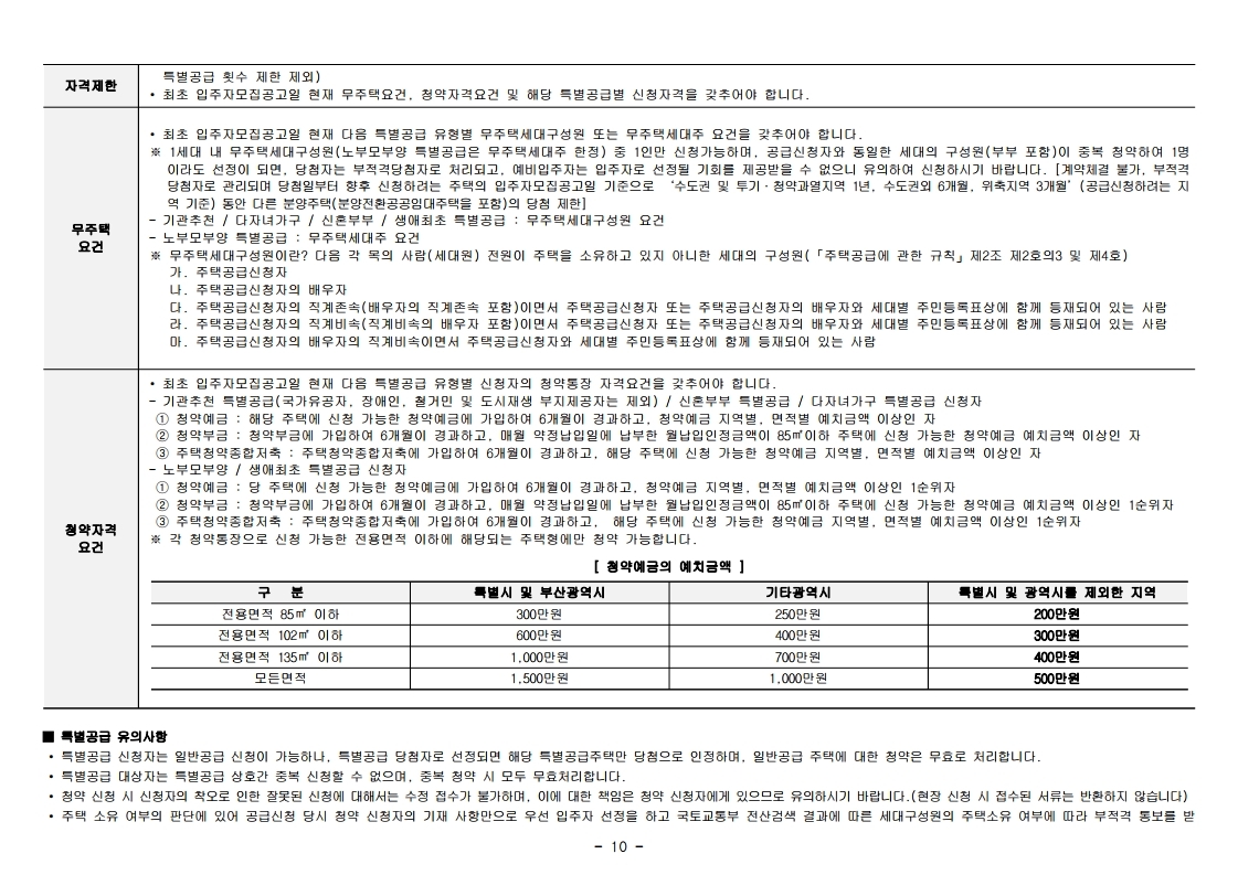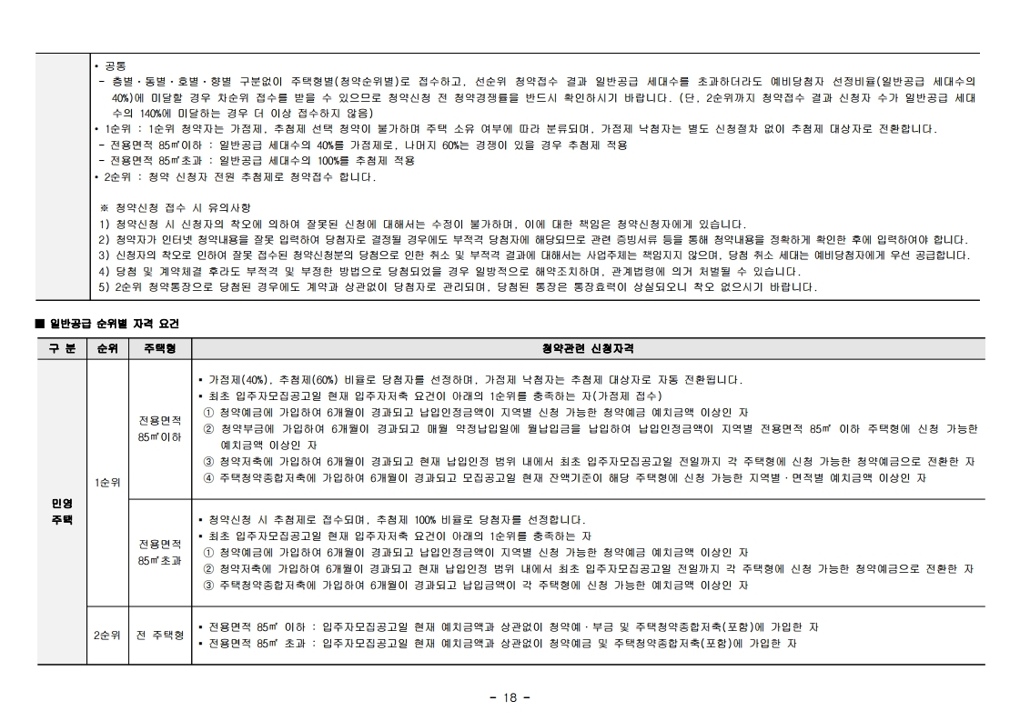 - 1순위 : (수도권외 비규제지역) 입주자저축에 가입하여 가입기간이 6개월이 경과하고 지역별/면적별 예치금액 이상 납입한 자