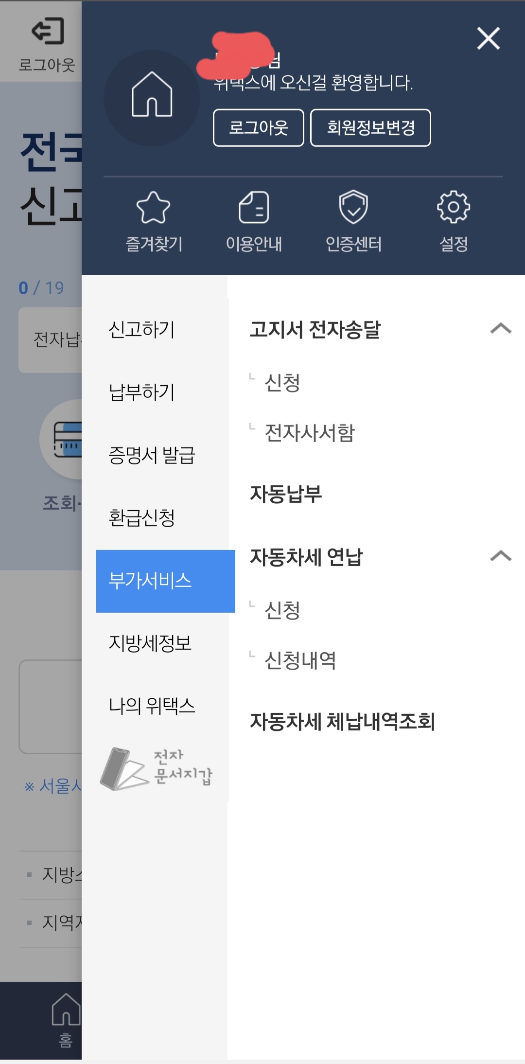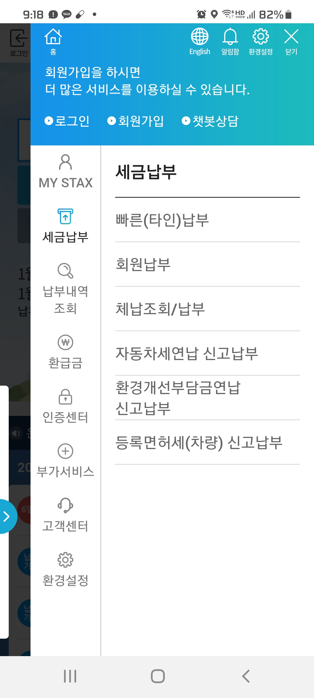 오른쪽 상단 메뉴를 들어가면 새창이 열립니다. 세금납부 메뉴에 자동차세 연납 신고납부 클릭하시면 가능합니다.