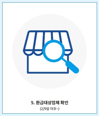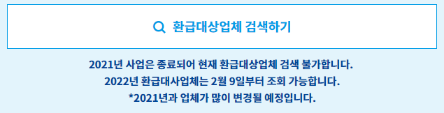 ※ 홈페이지 내 ‘환급대상업체 찾기’ 버튼을 통해 2월 9일부터 환급(캐시백) 가능한 시설 검색 가능