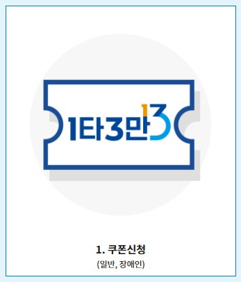 | 지원방법 | ㅇ 1타 3만 홈페이지에서 국민참여접수 기간에 참여신청 - 장애인으로 신청 : 장애인등록증 또는 복지카드 첨부 필수 (선착순 X) - 일반으로 신청 : 만 65세 이상 노인 및 일반 국민 (경로의 경우 선착순 X) (*만 65세 기준 : 1957년 12월 31일 이전 출생자) |