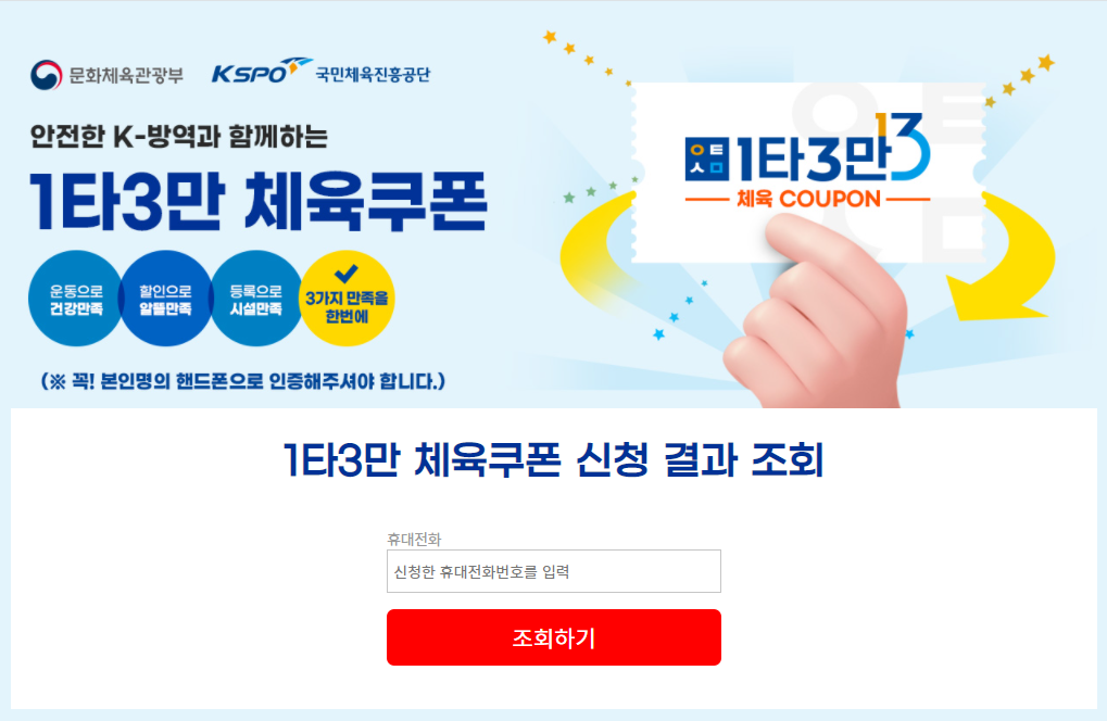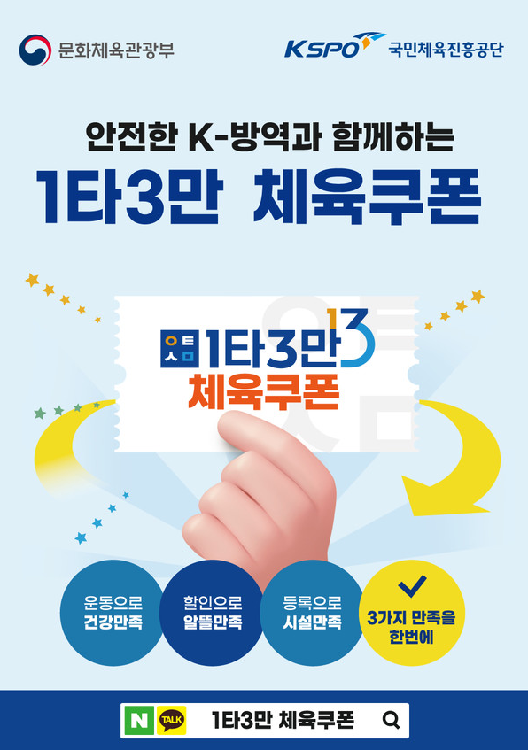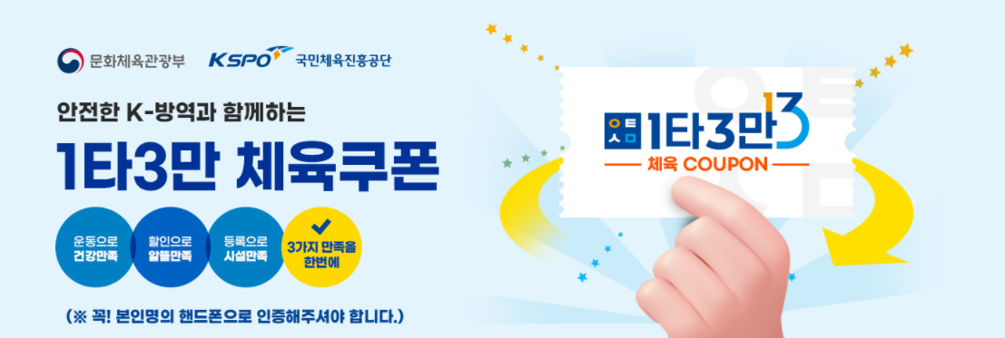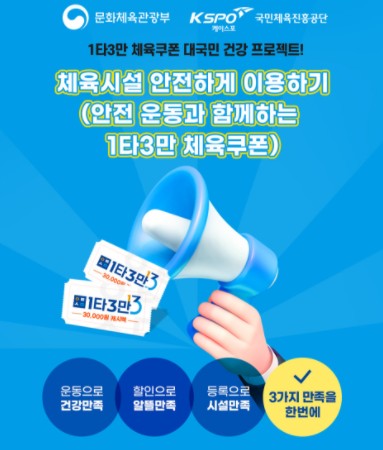 국민체육진흥공단과 문화체육관광부가 함께 실내 민간체육시설 이용 활성화를 위해 1타3만 체육쿠폰 2차 접수를 시작합니다. 실내체육시설에서 누적 8만 원 이상 쓰면 3만 원을 환급받을 수 있는 1타3만체육쿠폰 신청하세요.