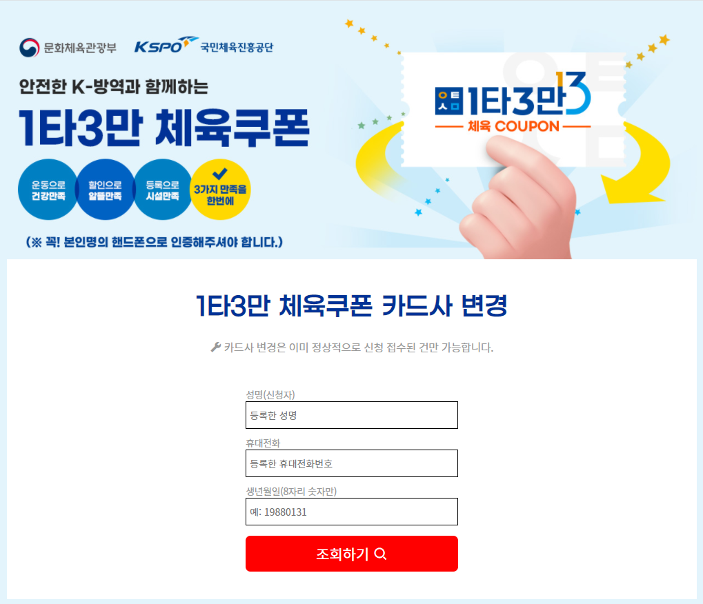 ★ 지역화폐 불가, 법인카드 불가, 재난지원금/상생지원금 가능, 가족카드/체크카드는 카드사별 정책이 달라 카드사로 문의 이 외에 소지하고 계신 카드를 쓰기 위해 어떤 카드사로 신청을 해야 하는지 확실하게 하기 위하여, 해당 카드사로 문의 후 신청 (예: ‘내가 가진 아이사랑카드로 결제해도 체육 쿠폰 환급되나요?’) 카드사 잘못 선택에 대한 책임은 본인에게 있으며, 향후 잘못 신청한 경우에도 구제가 어렵습니다. ※카드 변경 희망시 : 신청기간 내(2월 6일까지만!!)에만!! 1타3만 체육쿠폰 홈페이지 - ‘신청 카드사 변경하기’ 버튼을 통해 카드 변경도 가능함. 2월 6일 이후 절대 카드 변경 안됩니다.
