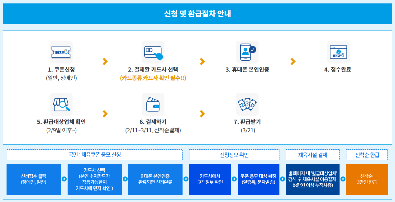 | ㅇ 참여신청 ▶ 환급대상업체 확인(2/9(수)부터 가능) ▶ 카드결제 및 시설이용 ▶ 환급 - 결제금액 기준 카드사별 선착순 환급 |