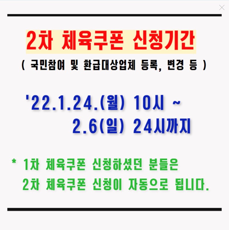 | 환급대상업체 신규 및 변경신청(체육시설업체) | `21.6.15. ~ `21.11.19. 18시까지 | '22.1.24.(월) 10시~2.6(일) 24시까지 |